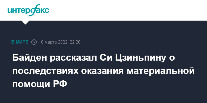 Москва. 18 марта. INTERFAX.RU - Президент США Джо Байден в пятницу в телефонном разговоре с председателем КНР Си Цзиньпином объяснил, какими будут последствия возможной материальной помощи Китая в отношении России, сообщает Белый дом.