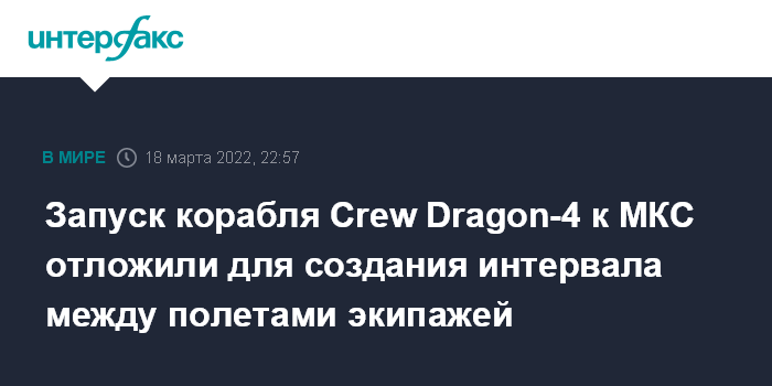 Москва. 18 марта. INTERFAX.RU - Запуск космического корабля SpaceX Crew Dragon с четырьмя астронавтами на борту к Международной космической станции (МКС) в рамках миссии Crew Dragon-4, запланированный на 15 апреля, переносится и состоится не ранее чем 19 апреля в целях создания интервала между полетами экипажей к станции, сообщает НАСА.