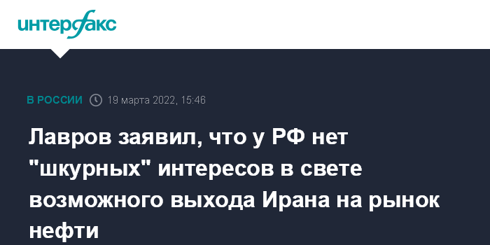 Москва. 19 марта. INTERFAX.RU - Россия не преследует "шкурных" интересов в связи с реализацией Совместного всеобъемлющего плана действий (СВПД) по урегулированию иранской ядерной проблемы, которая откроет Ирану путь на мировой нефтяной рынок, заявил глава МИД РФ Сергей Лавров.