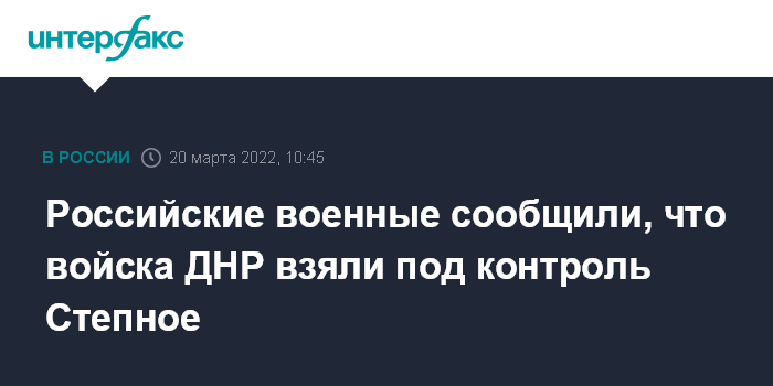 Москва. 20 марта. INTERFAX.RU - Группировка войск Донецкой Народной Республики, развивая наступление, взяла под полный контроль населенный пункт Степное и преследует отступающие подразделения 53-й отдельной механизированной бригады украинских вооруженных сил, сообщил официальный представитель министерства обороны РФ Игорь Конашенков на брифинге в воскресенье.