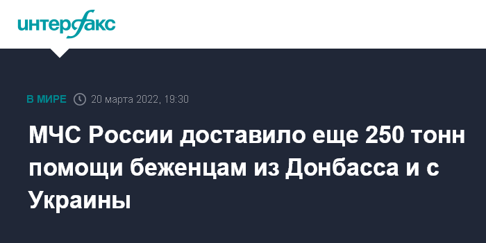 "20 марта колоннами из 24 единиц большегрузной техники Ногинского и Донского спасательных центров МЧС России доставлена очередная партия гуманитарного груза общим объемом порядка 250 тонн. Формирование грузов происходило в Белгородской и Ростовской областях, а также в Республике Крым", - говорится в сообщении, поступившем в "Интерфакс".