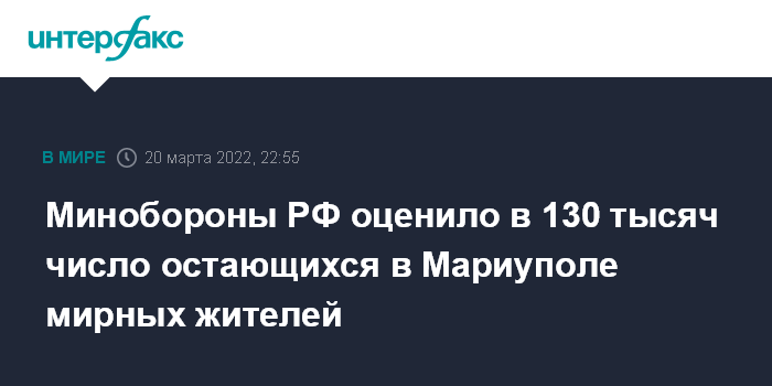 Москва. 20 марта. INTERFAX.RU - В городе Мариуполь на юго-востоке Украины находятся до 130 тысяч жителей, сообщил начальник Национального центра управления обороной РФ Михаил Мизинцев.