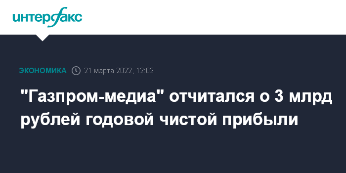 Москва. 21 марта. INTERFAX.RU - "Газпром-медиа холдинг" сообщил, что в 2021 году получил чистую прибыль свыше 3 млрд рублей против 5,5 млрд рублей убытка годом ранее на фоне ускорения роста выручки. Операционная прибыль ГМХ достигла 3,1 млрд рублей.