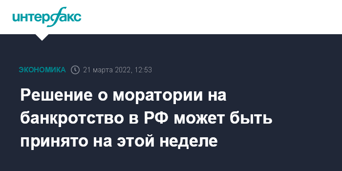 Москва. 21 марта. INTERFAX.RU - Правительство РФ на этой неделе может принять решение об объявлении моратория на банкротства, заявил журналистам глава Минэкономразвития Максим Решетников.