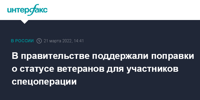 Москва. 21 марта. INTERFAX.RU - Комиссия правительства по законопроектной деятельности поддержала законопроект, по которому статус ветерана и инвалида боевых действий планируется распространить на тех, кто выполняет задачи в ходе специальной военной операции с 24 февраля.