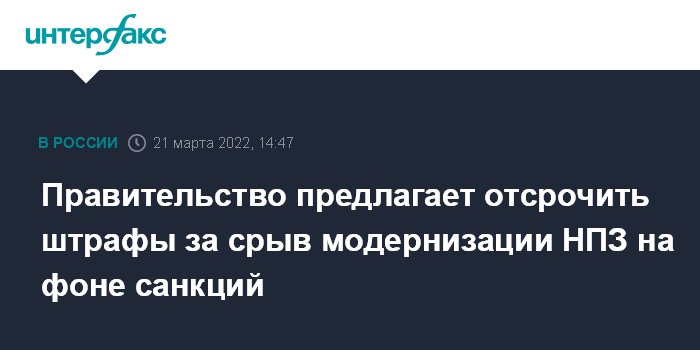 Москва. 21 марта. INTERFAX.RU - Правительство РФ предложило ввести отсрочку по штрафам или не применять их за срыв модернизации нефтеперерабатывающих заводов на фоне санкций, сообщил вице-премьер Александр Новак в ходе встречи с фракцией "Единая Россия" в Госдуме.