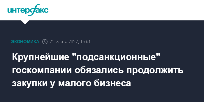 Москва. 21 марта. INTERFAX.RU - Крупнейшие госкомпании, находящиеся под санкциями, обязались продолжить осуществление закупок у субъектов малого и среднего предпринимательства (МСП), сообщили "Интерфаксу" в пресс-службе "Корпорации МСП", осуществляющий, в частности, мониторинг выполнения госкомпаниями требований по закупкам товаров, работ, услуг у малого бизнеса.