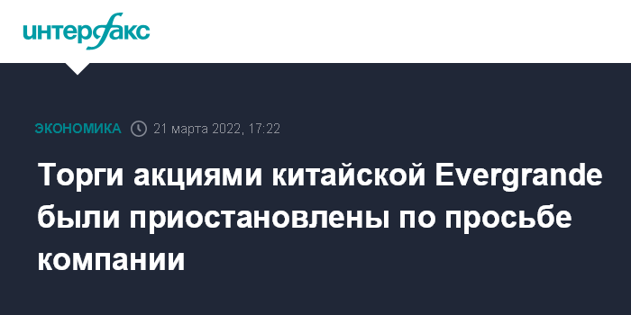 Москва. 21 марта. INTERFAX.RU - Торги акциями китайского застройщика China Evergrande Group были приостановлены в понедельник по просьбе компании, заявившей о готовящейся публикации внутренней информации.