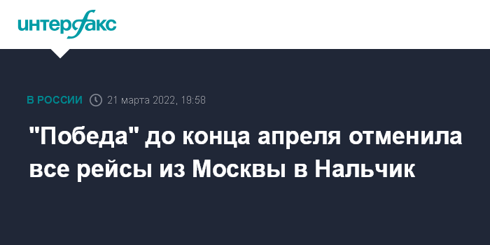 Москва. 21 марта. INTERFAX.RU - Авиакомпания "Победа" отменила до 30 апреля все рейсы из Москвы в аэропорт "Нальчик" (Кабардино-Балкария), сообщается в телеграм-канале аэропорта.