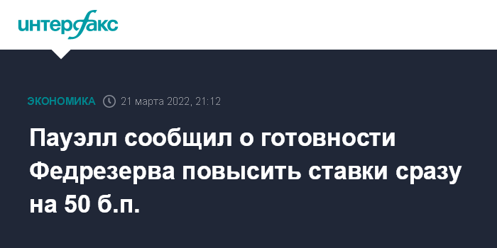 Москва. 21 марта. INTERFAX.RU - Федеральная резервная система (ФРС) США готова к повышению ключевой ставки сразу на 50 базисных пунктов вместо традиционных 25 б.п. в случае необходимости, заявил председатель ФРС Джером Пауэлл.