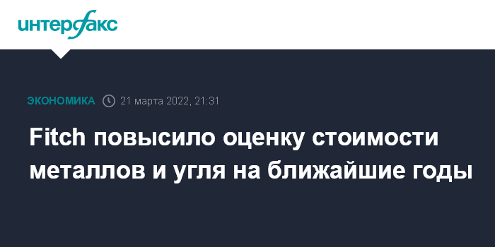 Москва. 21 марта. INTERFAX.RU - Международное рейтинговое агентство Fitch Ratings повысило оценку стоимости основных металлов и угля, которую оно использует в прогнозах операционной деятельности и финансовых показателей компаний отрасли.