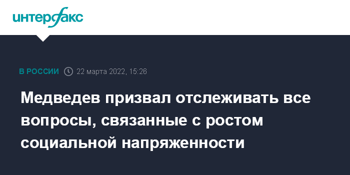 "Из-за беспрецедентного экономического давления может возникнуть рост безработицы. (...) Поэтому вопросы, связанные с возникновением социальной напряженности, нужно максимально внимательно отслеживать", - сказал Медведев на совещании по вопросу о развитии криминогенной обстановки в РФ.