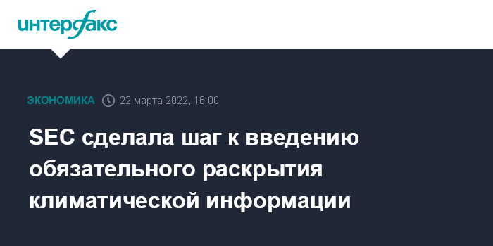 Москва. 22 марта. INTERFAX.RU - Комиссия по ценным бумагам и биржам (SEC) США решила вынести на общественное обсуждение проект нормативного акта, вводящего обязательное раскрытие эмитентами информации о климатических рисках.