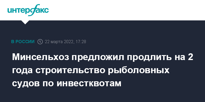 Москва. 22 марта. INTERFAX.RU - Минсельхоз РФ в связи с введением антироссийских санкций предлагает продлить на два года сроки строительства рыболовных судов, которое ведется в рамках инвестиционных квот. Это следует из пояснительной записки к соответствующему проекту постановления правительства, который разработан ведомством и размещен на сайте проектов нормативных актов.
