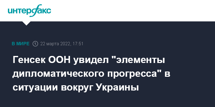 Москва. 22 марта. INTERFAX.RU - Генсек ООН Антониу Гутерриш во вторник заявил, что наблюдается определенный дипломатический прогресс в решении кризиса на Украине.