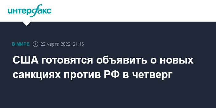 Москва. 22 марта. INTERFAX.RU - США и их западные партнеры намерены в четверг объявить о новых санкциях против России, заявил советник американского президента по нацбезопасности Джейк Салливан.