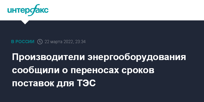 Москва. 22 марта. INTERFAX.RU - Производители энергооборудования направили в адрес генерирующих компаний обращения о вынужденном переносе сроков поставок оборудования для проектов модернизации ТЭС, сообщил "Совет производителей энергии" (СПЭ, объединяет крупнейшие энергокомпании РФ).