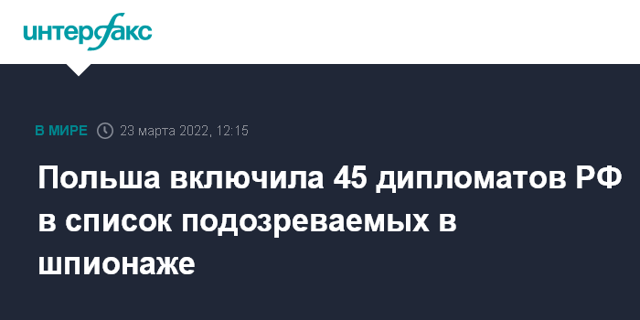 Москва. 23 марта. INTERFAX.RU - Представитель Агентства внутренней безопасности Польши Станислав Жарын в среду в эфире польского телевидения подтвердил, что власти страны составили список из 45 российских дипломатов, которых подозревают в шпионаже, сообщает Bloomberg.
