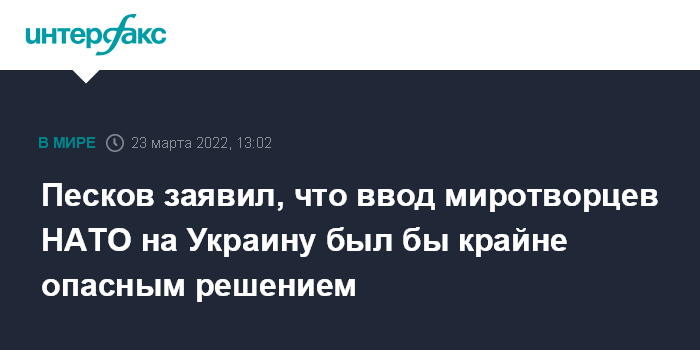 Москва. 23 марта. INTERFAX.RU - Ввод миротворцев НАТО на Украину был бы опрометчивым и крайне опасным решением, заявил пресс-секретарь президента РФ Дмитрий Песков.