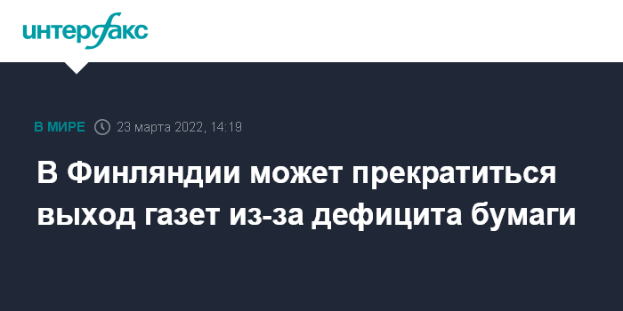 Москва. 23 марта. INTERFAX.RU - В Финляндии в ближайшие недели может прекратиться выход газет из-за дефицита печатной бумаги, в том числе импортируемой из России. Об этом сообщил в среду порталу телерадиовещания Yle исполнительный директор Союза медиа Юкка Холмберг.