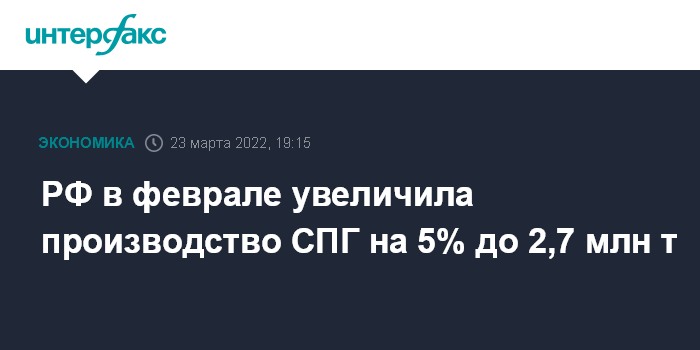 "Сжиженного природного газа (СПГ) в феврале произведено 2,7 млн т, что на 4,7% больше, чем в феврале 2021 года, но на 9,8% меньше, чем в январе 2022 года", - говорится в сводке федеральной службы.