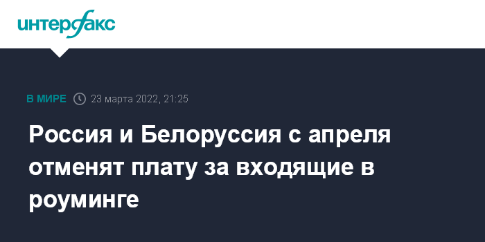 Москва. 23 марта. INTERFAX.RU - Российское Минцифры РФ и Министерство связи и информатизации Белоруссии обеспечат отмену платы за входящие звонки в роуминге на территории Союзного государства с 1 апреля.