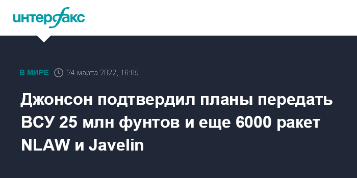 Москва. 24 марта. INTERFAX.RU - Британский премьер-министр Борис Джонсон пообещал на саммите НАТО призвать союзников по альянсу усилить военную и экономическую поддержку Украины, а от своей страны пообещал передать Киеву дополнительно 6000 ракет в дополнение к уже поставленным 4000 NLAW и Javelin.