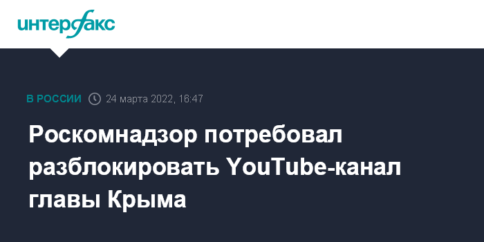 "24 марта Роскомнадзор потребовал от администрации видеохостинга YouTube (принадлежит американской компании Google LLC) в кратчайшие сроки восстановить доступ к официальному каналу главы Республики Крым С.В. Аксёнова и объяснить причину наложенных ограничений", - информирует РКН.