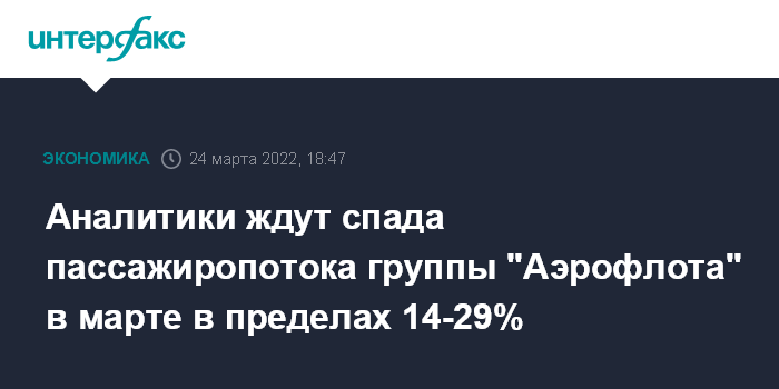 Москва. 24 марта. INTERFAX.RU - В марте пассажиропоток группы "Аэрофлот" снизится в годовом измерении в диапазоне 14-29%, считают опрошенные "Интерфаксом" аналитики инвестбанков.