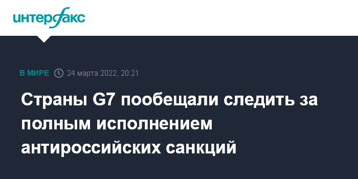 Москва. 24 марта. INTERFAX.RU - Лидеры стран "Большой семерки" пообещали сообща и целенаправленно следить за выполнением санкционных ограничений в отношении России и координировать ответы на попытки их обхода, говорится в совместном заявлении глав государств и правительств G7.