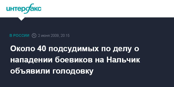 Нальчик. 2 июня. INTERFAX.RU - Около 40 подсудимых по делу о нападении боевиков на Нальчик в октябре 2005 г. объявили голодовку, требуя отправить в больницу одного из фигурантов дела, которому стало плохо в зале суда.