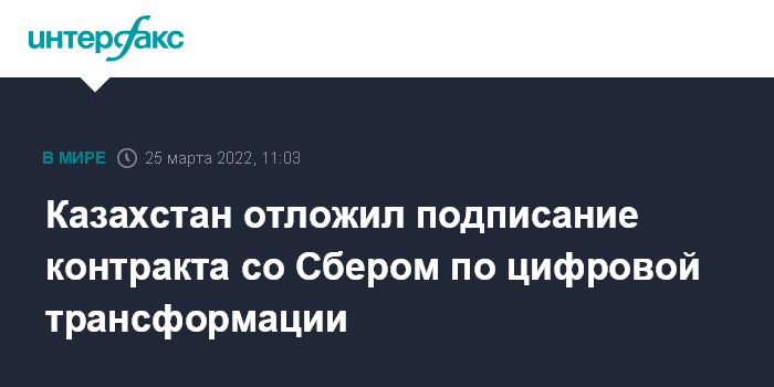 Москва. 25 марта. INTERFAX.RU - Казахстан откладывает подписание контракта со Сбербанком России по цифровой трансформации, анализирует альтернативные варианты. Об этом сообщили агентству "Интерфакс" в министерстве цифрового развития, инноваций и аэрокосмической промышленности.