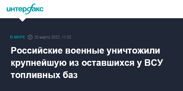 Москва. 25 марта. INTERFAX.RU - Российские военные уничтожили одну из крупнейших украинских топливных баз, расположенную в Киевской области, заявил официальный представитель Минобороны РФ Игорь Конашенков.