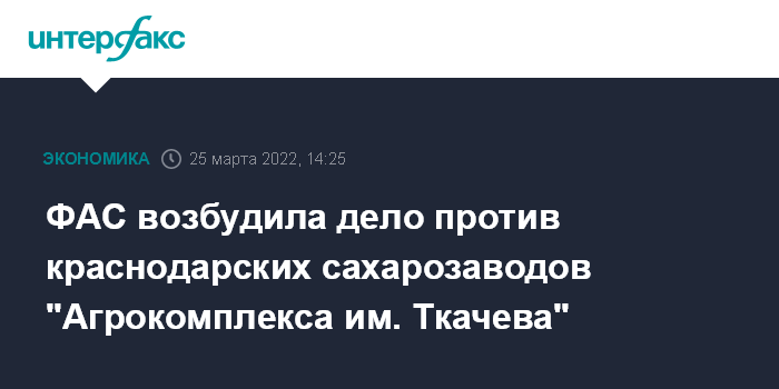 ФАС возбудила дело против краснодарских сахарозаводов "Агрокомплекса им. Ткачева"