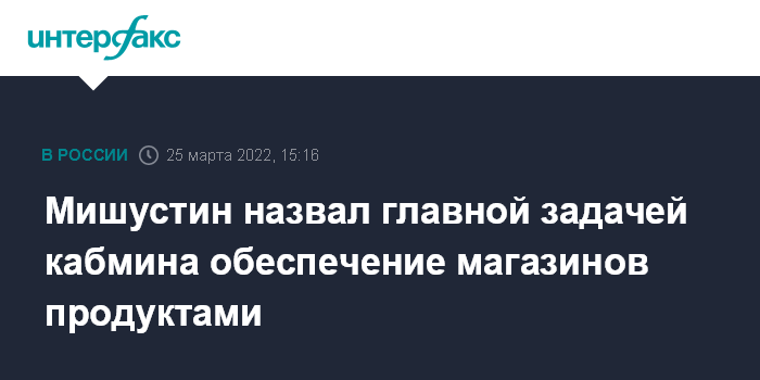 Москва. 25 марта. INTERFAX.RU - Главная задача правительства РФ на сегодняшний день - это обеспечение продовольственной безопасности, на полках магазинов должны быть необходимые товары, заявил премьер-министр Михаил Мишустин.