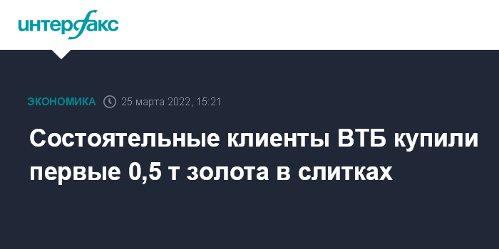 Москва. 25 марта. INTERFAX.RU - Клиенты ВТБ приобрели первые 0,5 тонны золота в слитках, заявил президент - председатель правления ВТБ Андрей Костин.