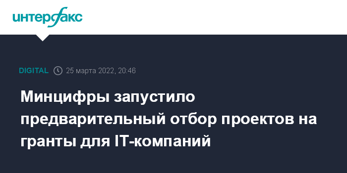 Москва. 25 марта. INTERFAX.RU - Минцифры запустило предварительный отбор проектов на грантовую поддержку для IT-компаний. Об этом заглавы Минцифры Максим Паршин сообщил на встрече со СМИ. Заполнить заявку компании смогут с помощью специальной формы на портале госуслуг.