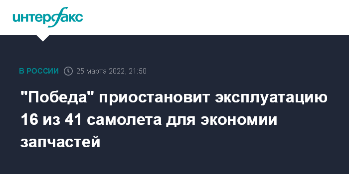 Москва. 25 марта. INTERFAX.RU - Авиакомпания "Победа" приостановит эксплуатацию 16 самолетов, следует из обращения временно исполняющего обязанности гендиректора компании Андрея Юрикова к сотрудникам.