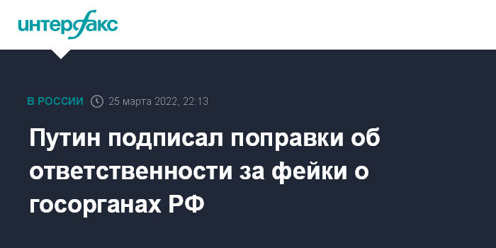 Москва. 25 марта. INTERFAX.RU - Президент России Владимир Путин подписал законы, вводящие поправки об ответственности за недостоверную информацию о работе госорганов РФ за рубежом; штрафы составят до 5 млн рублей, максимальные сроки лишения свободы до 15 лет.