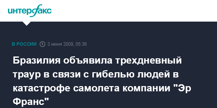 Москва. 3 июня. ИНТЕРФАКС - В Бразилии объявлен трехдневный траур в связи с катастрофой пассажирского лайнера А-330 французской авиакомпании "Эр Франс", передает британская телерадиокорпорация Би-би-си. Соответствующий указ подписал вице-президент Бразилии Жозе Аленкар.