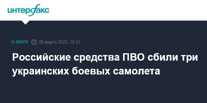 Москва. 26 марта. INTERFAX.RU - Российские средства ПВО сбили три украинских самолета и шесть беспилотников, сообщил официальный представитель Минобороны РФ Игорь Конашенков.