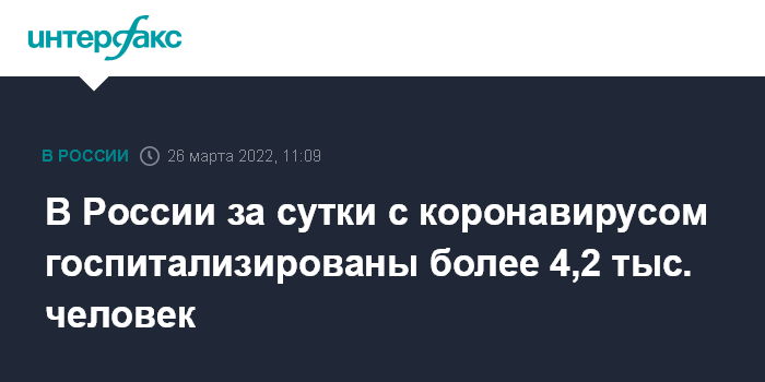 Москва. 26 марта. INTERFAX.RU - В России за минувшие сутки были госпитализированы 4 275 человек с коронавирусом, следует из данных оперативного штаба, обнародованных в субботу.