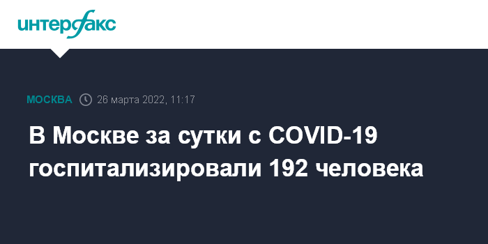 Москва. 26 марта. INTERFAX.RU - В Москве за последние 24 часа было госпитализировано 192 человека с коронавирусом, следует из данных портала "Стопкоронавирус.рф".