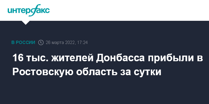 Москва. 26 марта. INTERFAX.RU - Поток беженцев с территорий Донбасса в Ростовскую область сохраняется: за прошедшие сутки регион принял около шестнадцати тысяч человек, сообщила пресс-служба областного пограничного управления ФСБ России.