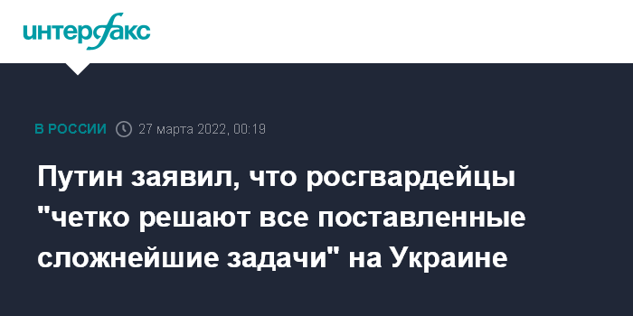 Москва. 27 марта. INTERFAX.RU - Президент России Владимир Путин поздравил росгвардейцев с их профессиональным праздником, отметив, что страна гордится военнослужащими и сотрудниками подразделений ведомства, участвующими в специальной военной операции на территории Донбасса и Украины, сообщает сайт Кремля.