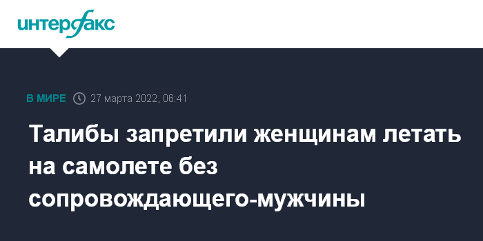 Москва. 27 марта. INTERFAX.RU - Находящееся у власти в Афганистане террористическое движение "Талибан" (запрещено в РФ) не допускает женщин к полетам на самолете как внутри страны, так и за границу в отсутствие сопровождающего мужчины, сообщает Associsted Press.