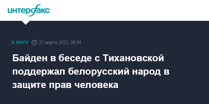 Москва. 27 марта. INTERFAX.RU - Президент США Джо Байден провел телефонный разговор с экс-кандидатом в президенты Белоруссии, лидером белорусской оппозиции Светланой Тихановской, сообщил Белый дом.