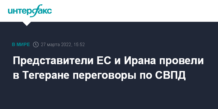 Москва. 27 марта. INTERFAX.RU - Главные переговорщики от ЕС Энрике Мора и Ирана Али Багери Кани провели в воскресенье в Тегеране переговоры о возрождении сделки по иранской ядерной программе, сообщило агентство "Мехр".