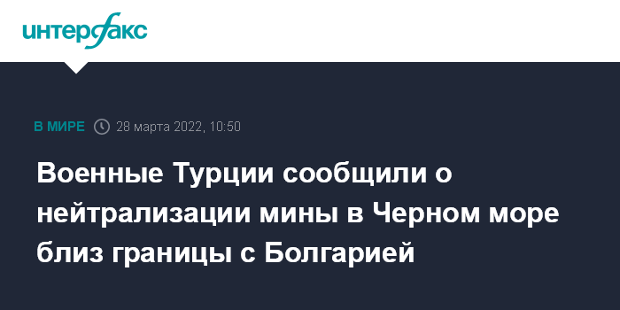 Москва. 28 марта. INTERFAX.RU - Минобороны Турции объявило об обнаружении и нейтрализации мины в Черном море у берегов населенного пункта Игнеада вблизи границы с Болгарией, сообщают в понедельник турецкие СМИ.