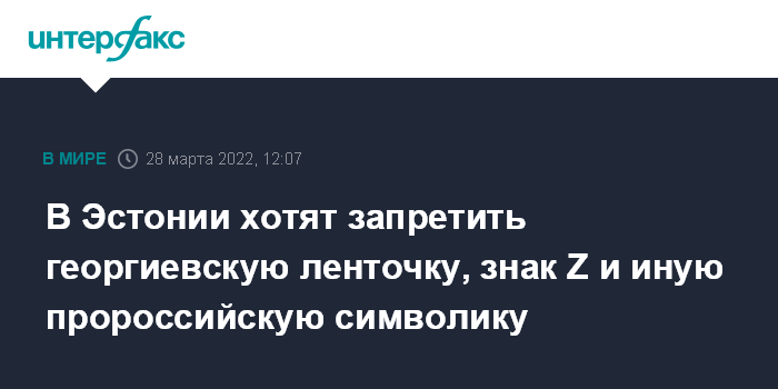 Москва. 28 марта. INTERFAX.RU - В министерстве юстиции Эстонии готовится законопроект о запрете георгиевской ленточки, знака Z и иной связанной с Россией символики.